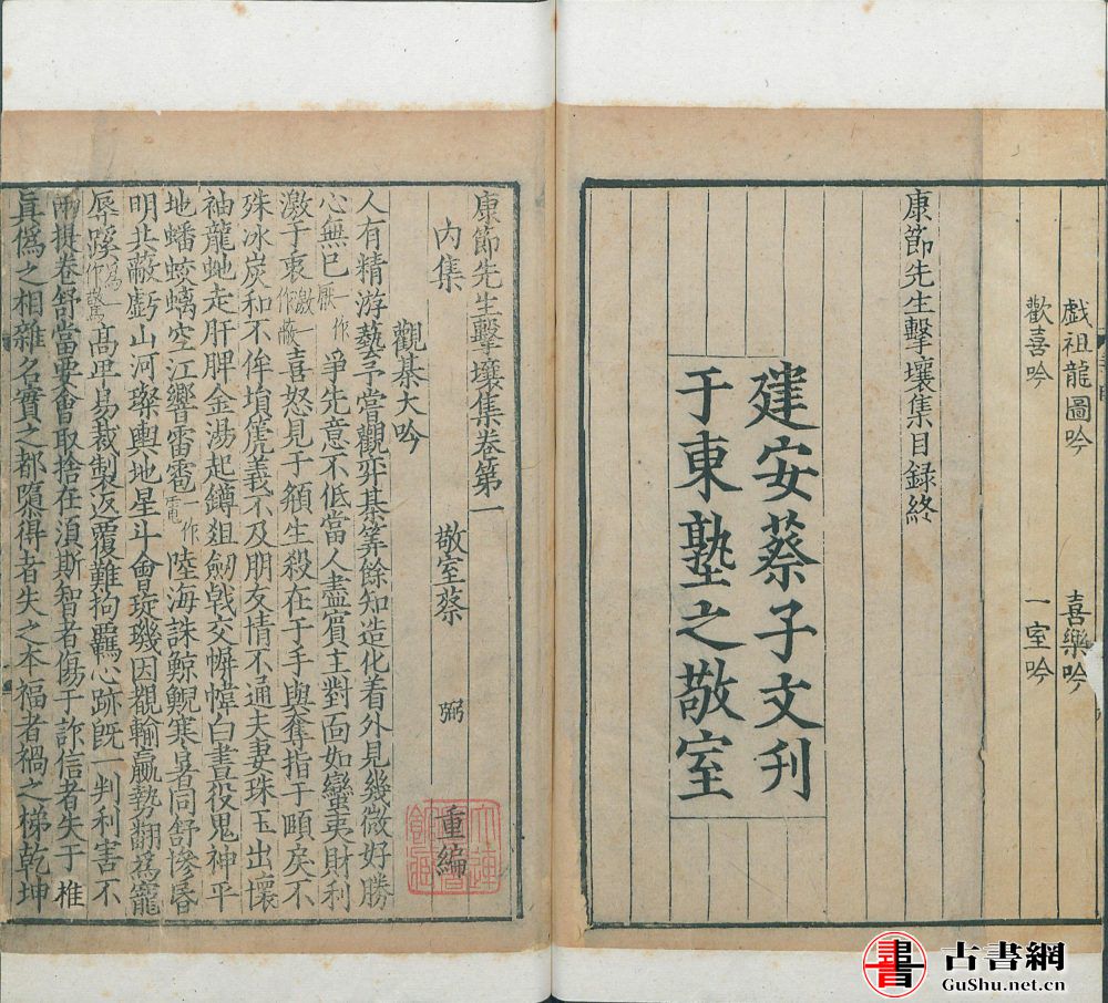 康节先生击壤集序(蔡弼撰)、目录 内集 外集 牌记:建安蔡子文刊 / 于東塾之敬室