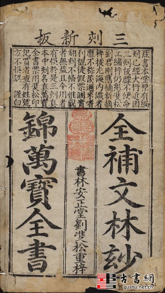 扉页题:全補文林妙錦萬寶全書,書林安正堂劉雙松重梓。