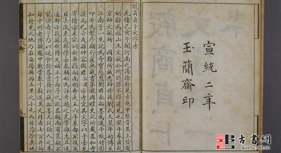 《殷商贞卜文字考.罗振玉撰》成书于1910年,是罗振玉研究甲骨文的第一部作品,其中释出单字近三百个,共三十二页。其书首页首行题书名,次行以下为罗振玉自序,其后为正文。正文分别为四篇,《考史第一》、《正名第二》、《卜法第三》、《余说第四》。