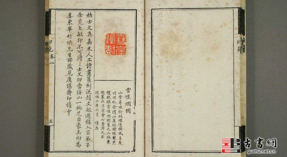此本为清藏书家顾湘的两套印谱合成一个文件,包含:小石山房印苑和学山堂印存。小石山房印苑收上自元朱珪下迄清程德椿,辑入印人103家,存印480方,并附释文及作者。