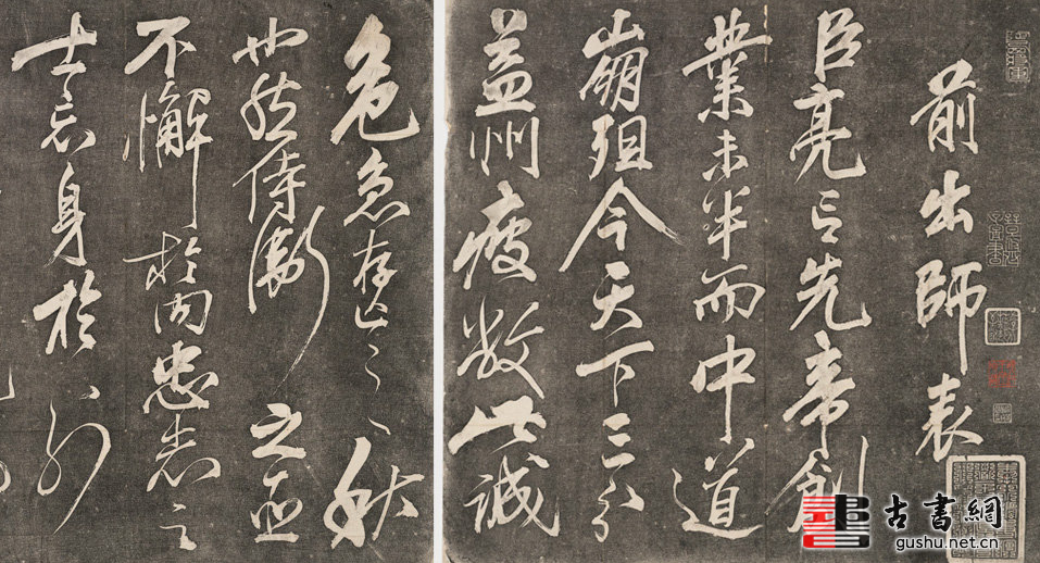 陕西省岐山县城南五丈塬,是诸葛亮几十年南征北战中最后一个战场。诸葛亮死后,唐初便有人在此立庙,后来殿内东西两壁镶嵌的40块二尺见方的岳飞书诸葛亮前后《出师表》石刻。此本为光绪4年的一个拓本。