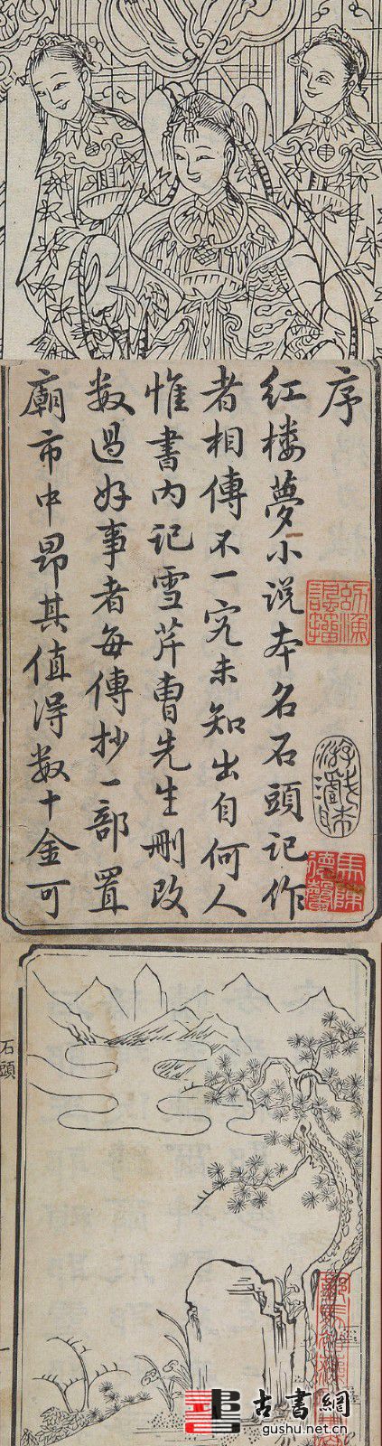 此本《新评绣像红楼梦全传》大约刊印于道光12年(1832),所含内容:红楼梦像,红楼梦论赞/读花人编,红楼梦问答,大观园插图, 红楼梦题词并序,红楼梦总评/王希廉作,红楼梦音释,红楼梦卷1-76/曹雪芹,王希廉评。文章内还有《新镌全部绣像红楼梦》一册(版画部分及卷1-3)。