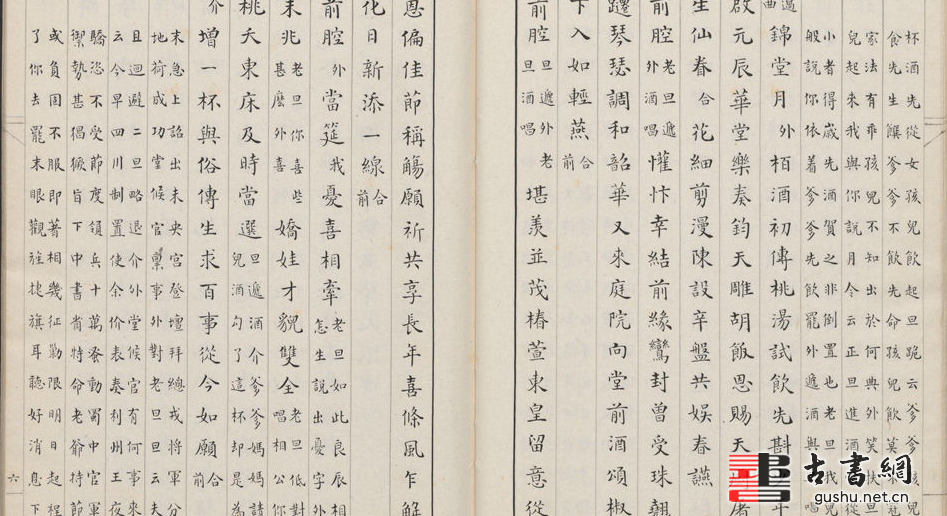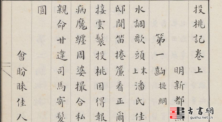 《投桃記》二卷,明汪廷訥撰,描繪得美妙至極。環翠堂是汪廷衲的堂名,汪家刻書中的版畫完全是徽州一派,線條細若髮絲,衣紋折迭、花飾圖桉以及人物造型。此本為民國時期王立承精鈔本。