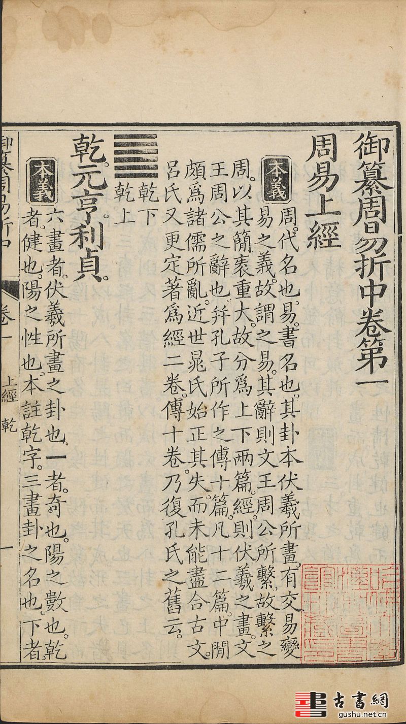 此本是清康熙皇帝参与编写关于《周易》的书籍,所以称作“御 纂”。清康熙年间设刻书处于武英殿,故有殿板之称。《折中》一书,由康熙所制序文介绍,乃“越二寒暑而告成”于康熙五十四年春。可知此书之作始于康熙五十二年。