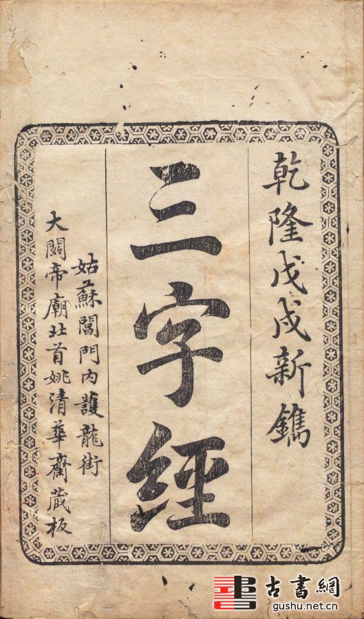 书名页题:乾隆戊戌新鐫/三字經/姑蘇閶門内護龍街/大関帝廟北首姚清華齋蔵板