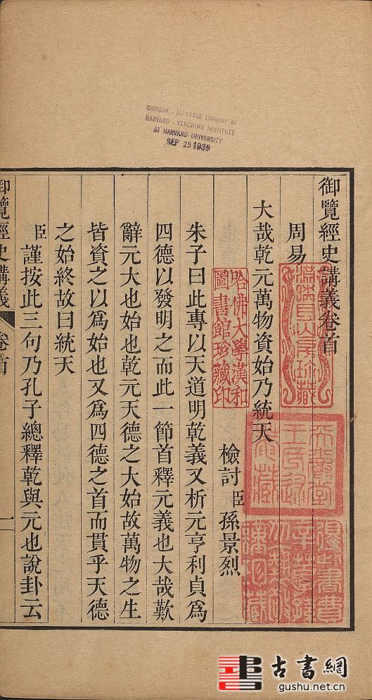 此《御览经史讲义》由清蒋溥等于乾隆十四年奉乾隆帝敕纂辑,大约在乾隆二十年完成。全书共三十一卷,共收讲义 716 篇,按照经(周易、书经、诗经、春秋、礼记、周礼)、史、性理等讲义内容排列。此为清乾隆时期武英殿刊本。