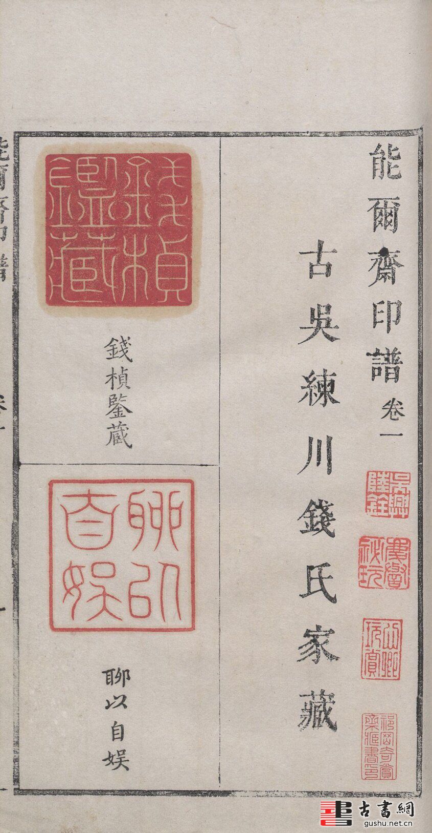 此《能尔斋印谱》由清代钱桢辑。全书共六卷,汇集明代至清初名家所刻印章而成。卷一收印四十方,卷二:三十八方,卷三、卷四各六十八方,卷五:七十二方,卷六:七十六方,总计三百六十二方,其中钱氏自用印七十余方。此为清康熙时期钤印本。