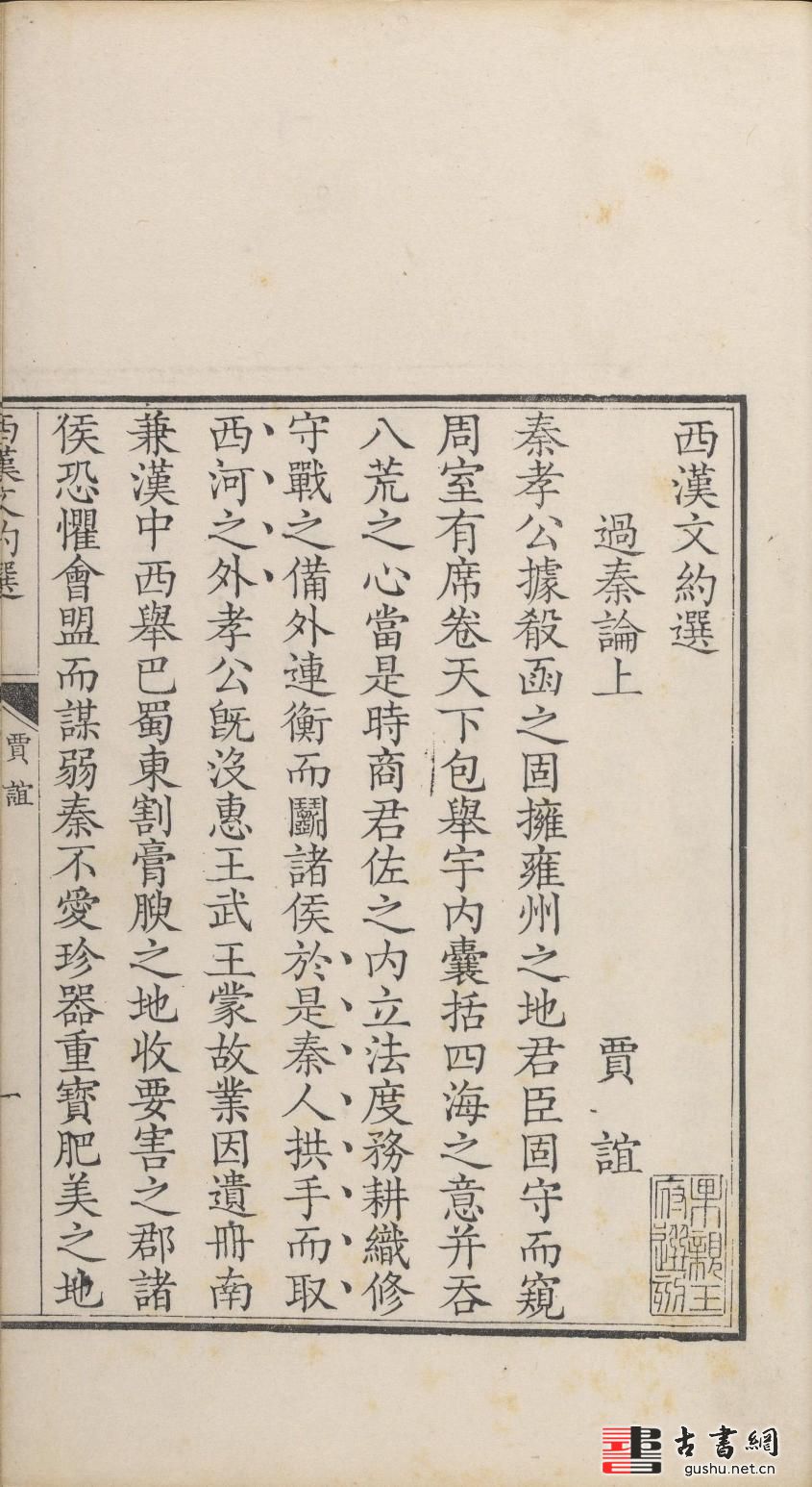 古文约选序(和硕果亲王撰)、凡例(方苞撰)、目录 西汉文约选,共选编西汉二十四人文三十九篇:贾谊四篇、晁错四篇、南越王佗一篇、邹阳一篇、枚乘一篇、董仲舒二篇、司马相如三篇、徐乐一篇、严安一篇、严助一篇、吾邱寿王一篇、司马迁二篇、李陵一篇、路温舒一篇、杨恽一篇、赵充国一篇、萧望之一篇、刘向四篇、贾捐之一篇、匡衡二篇、李寻一篇、刘歆二篇、贾让一篇、扬雄一篇 东汉文约选,共选东汉四人文四篇:班彪一篇、班固一篇、李固一篇、崔寔一篇 后汉文约选,后汉:诸葛亮前、后出师表二篇 韩退之文约选,选韩愈文七十二篇 柳子厚文约选,选柳宗元文四十五篇 欧阳永叔文约选,选欧阳修文五十八篇 苏明允文约选,选苏洵文三十二篇((內原缺:自明論至送石昌言使北引) 苏子瞻文约选,选苏轼文三十四篇 苏子由文约选,选苏辙文二十篇 曾子固文约选,选曾巩文二十六篇 王介甫文约选,选王安石文二十六篇 此书版式舒展,字体秀丽规整,可谓清代写刻本的上品。卷端下刻印有「果親王府選刻」长形阳刻墨记