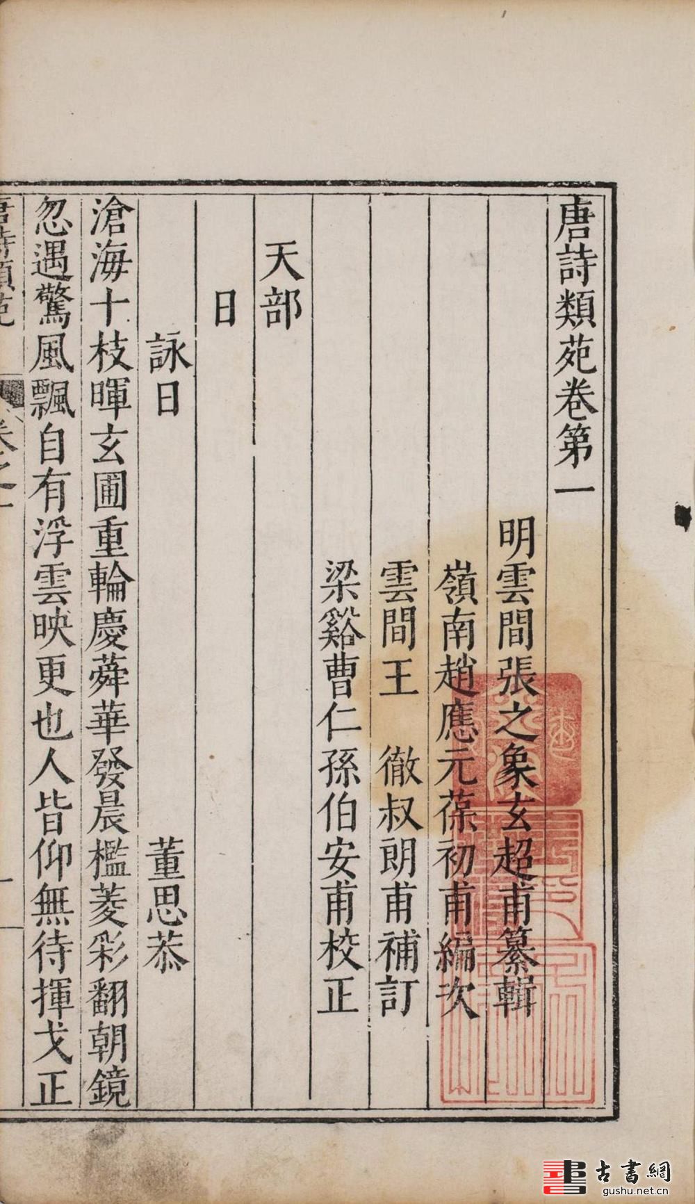 历代总集常见的类型有三种,即分体、分类、编年。唐诗选本自唐顾陶《唐诗类选》始以类编排,继之以北宋李昉等人的《文苑英华》、王安石的《唐百家诗选》(分类本今存残卷)、南宋赵孟奎的《分门纂类唐歌诗》、宋末元初方回的《瀛奎律髓》。至明代张之象《唐诗类苑》的出现,才算是真正意义上分类编纂的唐诗总集。原因在于:顾陶《唐诗类选》已佚,惟《文苑英华》卷七一四载有顾陶《唐诗类选序》和《唐诗类选后序》,能推知此书概貌一二。《文苑英华》并不是严格意义上的唐诗总集,而是一部收录南朝梁末至唐五代的诗文总集,其编纂体例是先分体后分类。王安石的《唐百家诗选》分类本现存只有宋刻残本,即《百宋一廛赋》所注在小读书堆的分类宋椠残本,现藏日本静嘉堂文库,中国国家图书馆藏有静嘉堂文库于日本昭和十一年(1936)影印宋刻分类本。赵孟奎的《分门纂类唐歌诗》已残缺,现存仅十一卷,即 “天地山川类” 五卷,“草木虫鱼类” 六卷,今有宛委别藏录绛云楼藏本《分门纂类唐歌诗残本》十一卷。方回的《瀛奎律髓》是一部专选唐宋五、七言律诗的诗歌选本,也不是严格意义上的唐诗选本。因此,作为分类编排体系的唐诗总集,《唐诗类苑》是现存最早、规模最大、体系相对完备的著作,是分类唐诗总集的扛鼎之作。(介绍参考:张之象《唐诗类苑》研究述略)