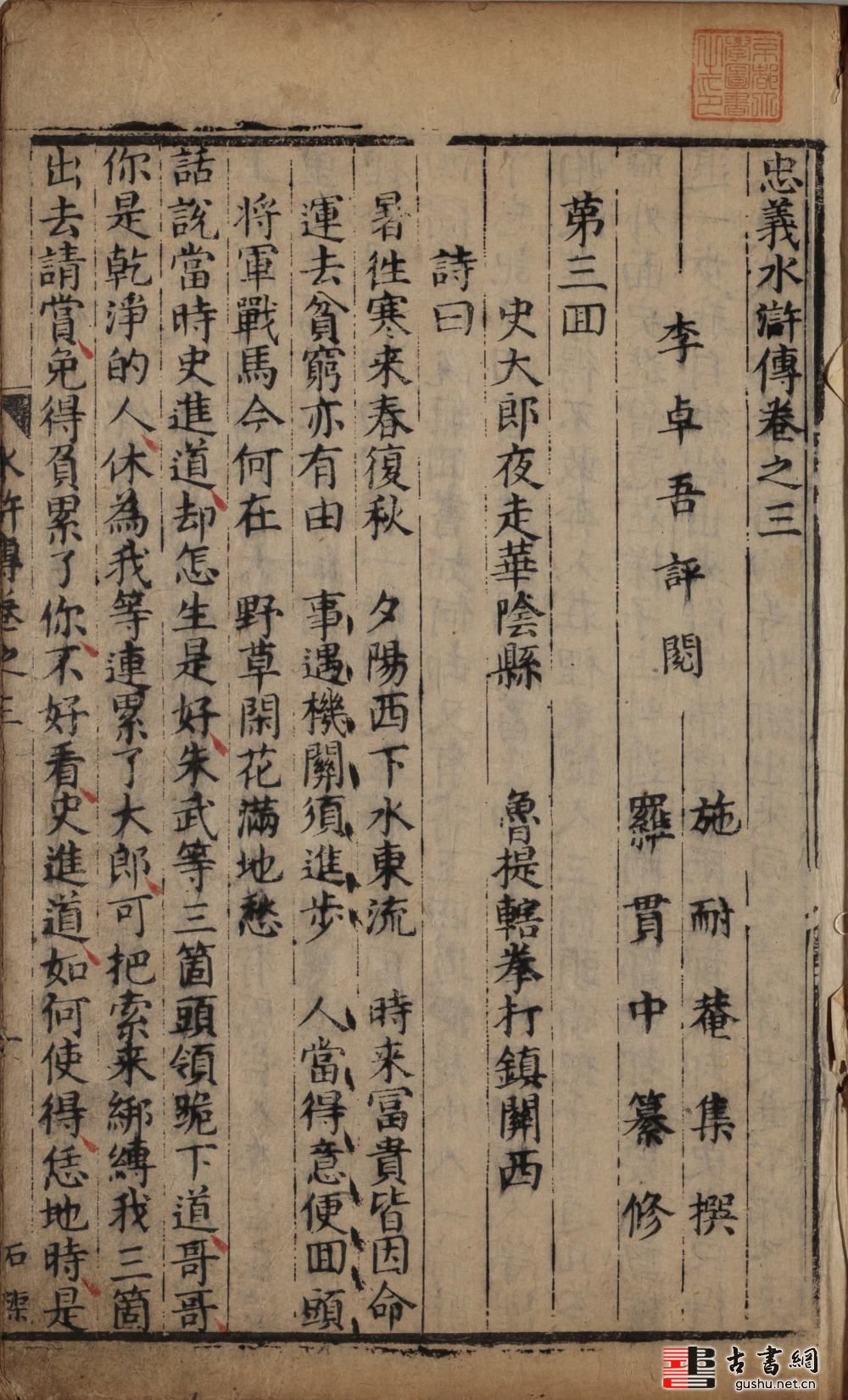 第一回(配补):张天师祈禳瘟疫,洪太尉误走妖魔 第三回:史大郎夜走华阴县,鲁提辖拳打镇关西 卷三首题:李卓吾評閱、施耐菴集撰、羅貫中纂修