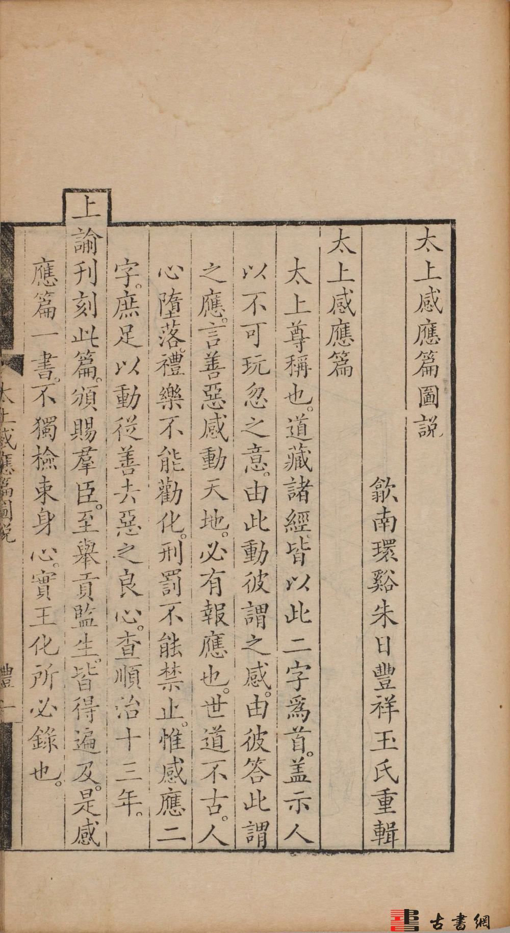 《太上感应篇》是宣扬天人感应和因果报应思想,旨在劝善惩恶,认为「祸福无门,惟人自召,善恶之报,如影随形」。天地之间有司过之神,家中有灶神,人体内亦有三尸神,时刻记録人之善恶,按时上天报告。行善者天必降福,依其行善多少而成各等神仙。为恶者天必降祸,依其罪恶轻重减夺寿弃。罪有余辜者,鞅及其子孙。书中所列善恶标准,皆属儒家伦理道德,是为神道设数之代表作,宋元明淸以来,此书流传甚广,影响极大。此《图说》篇首云:「太上,尊称也。道藏诸经皆以此二字为首,盖示人以不可玩忽之意,由此动彼谓之感,由彼答此谓之应,言善恶、动天地,必有报应也。世道不古,人心堕落,礼乐不能劝化,刑罚不能禁止,惟感应二字,庶足以动从善去恶之良心。查顺治十三年,上谕刊刻此篇,颁赐群臣,至举贡监生皆得遍及。是《感应篇》一书,不独检束身心,实王化所必录也。
