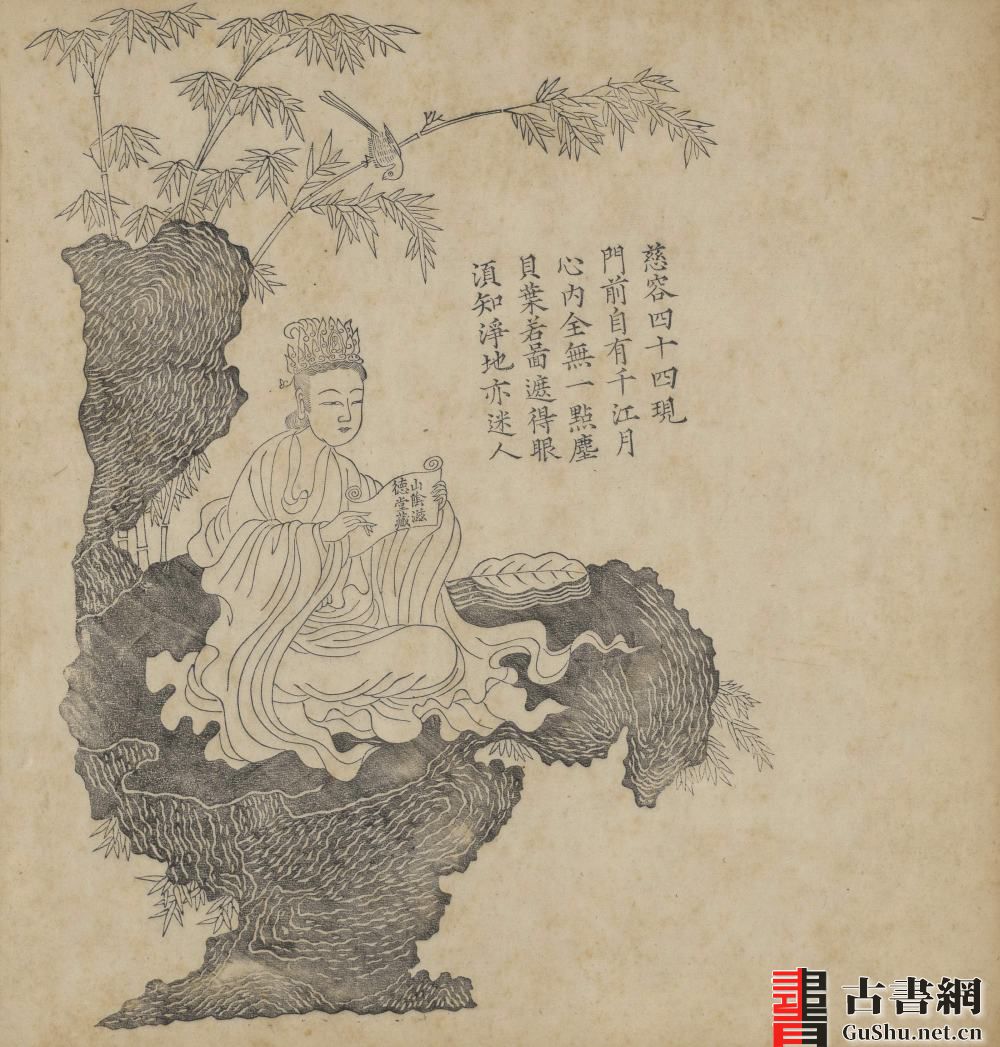 此《观世音菩萨慈容五十三现》画册绘者未知。其中描绘了普陀梵音洞大士示相五十三种(多为女相,并融入善财童子),前附护法韦陀一幅,每幅附赞诗。此本大致为清康熙时期山阴戴王瀛滋德堂刊本,绘刻精工,线条流畅。
