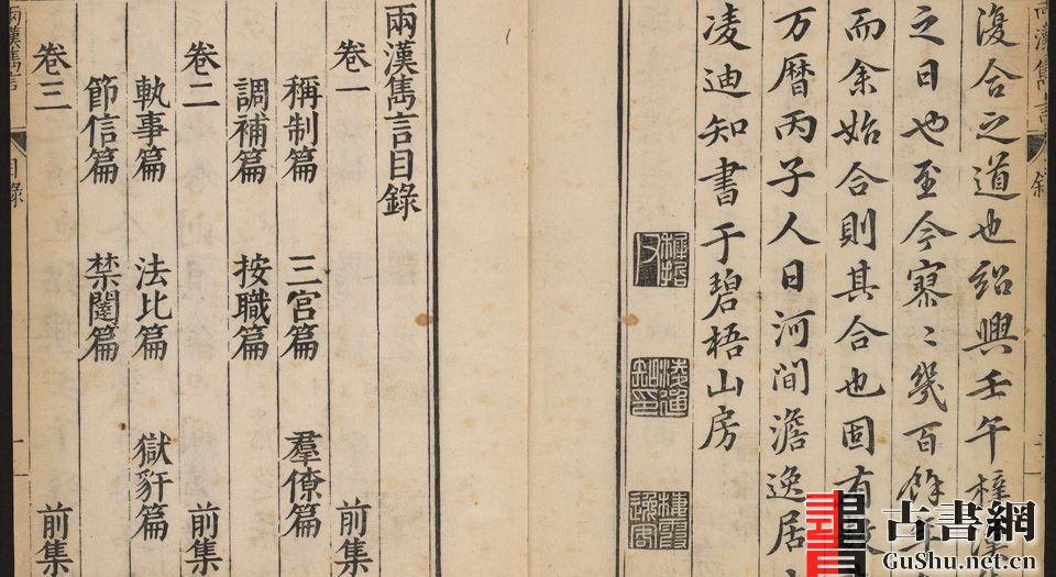 四库提要介绍:《两汉隽言》明凌迪知编。宋林越作《汉隽》,所采止于《西汉》。迪知因仿越体例,辑《后汉》故实,与越书合为一编,改题今名。自第一卷至十卷,皆林氏之旧,题曰《前集》。十一卷至十六卷,迪知所续者,题曰《后集》。采摭亦备。然不自为一书,而补葺旧本,创立新名,是则明人之结习矣。
