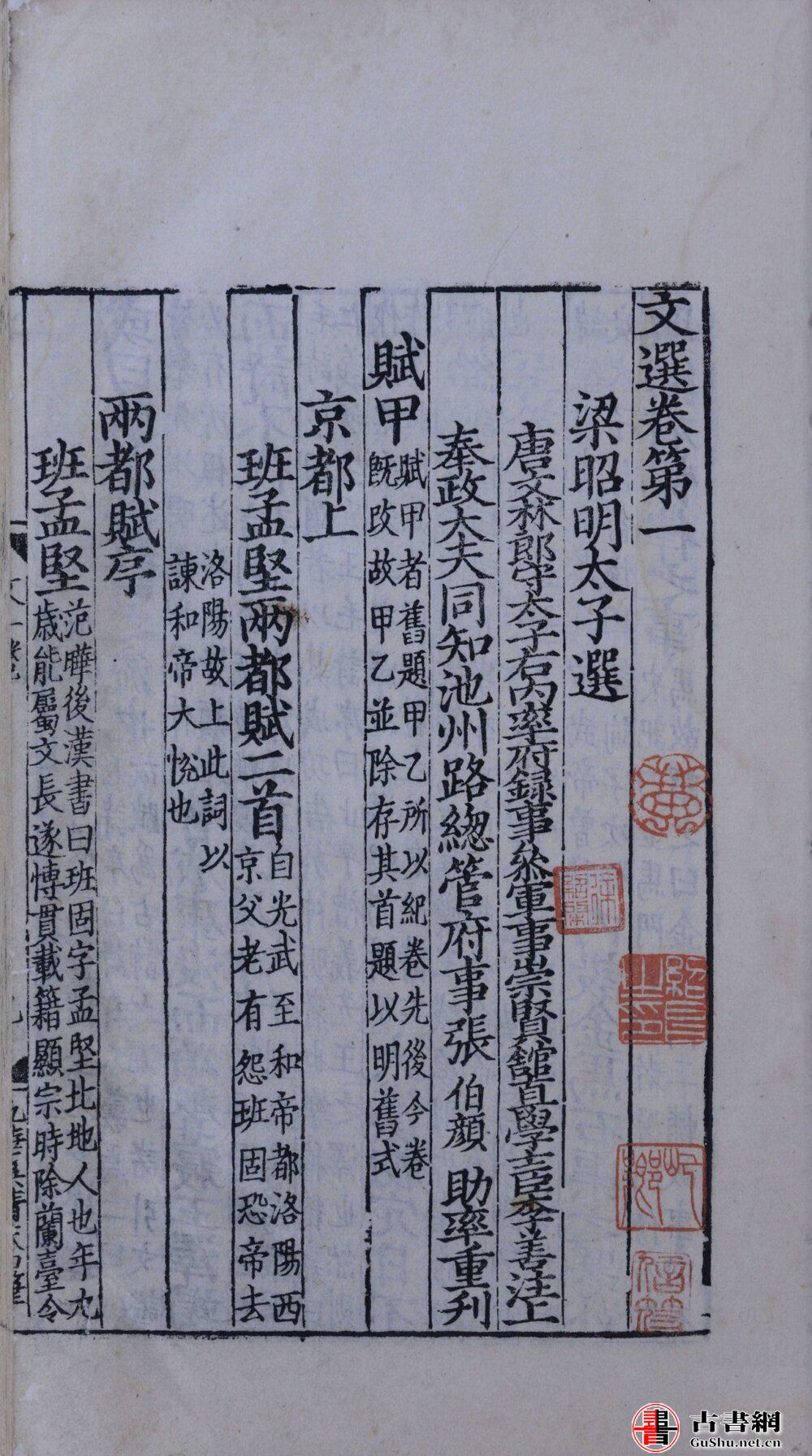 《文选》是中国现存的最早一部诗文总集,由南朝梁武帝长子萧统组织文人共同编选。此《文选》由唐李善注,全书共六十卷,选录了先秦至南朝梁代八九百年间、一百多个作者、七百余篇各种体裁的文学作品。此为明嘉靖元年金台汪谅校覆刊元张伯颜本,书前目录后有书目广告(已知最早)一则。
