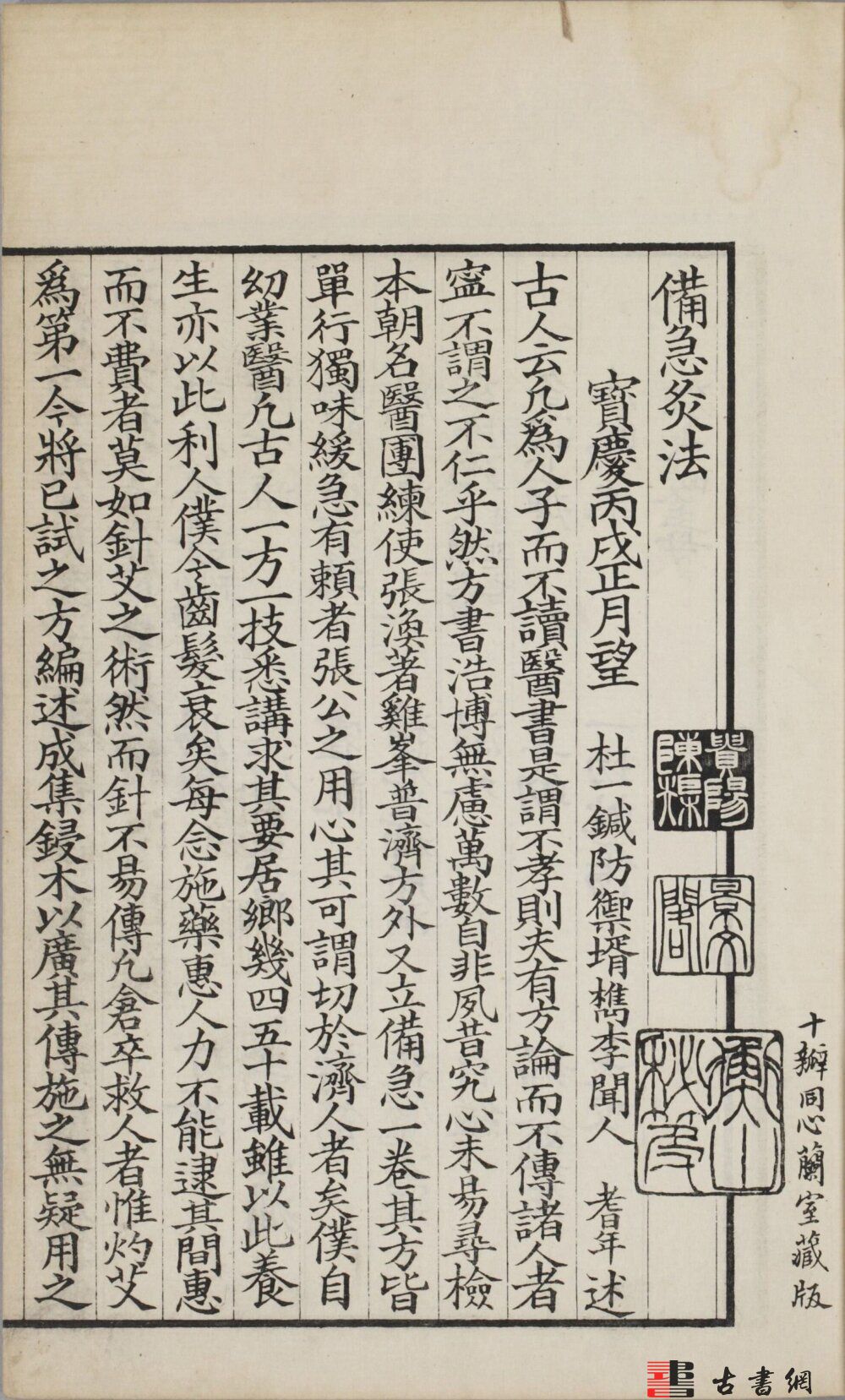 此《备急灸方》为南宋医家闻人耆年撰灸法专著。此书介绍诸发、肠痈、溺水、自缴、蛇咬伤等 22 种急证灸治方,每方均记出处,并有简明图说。后附佚名氏《骑竹马灸法》及《竹阁经验备急药方》。此为上杭罗氏十瓣同心兰室藏版,清光绪十六年影宋刊本。