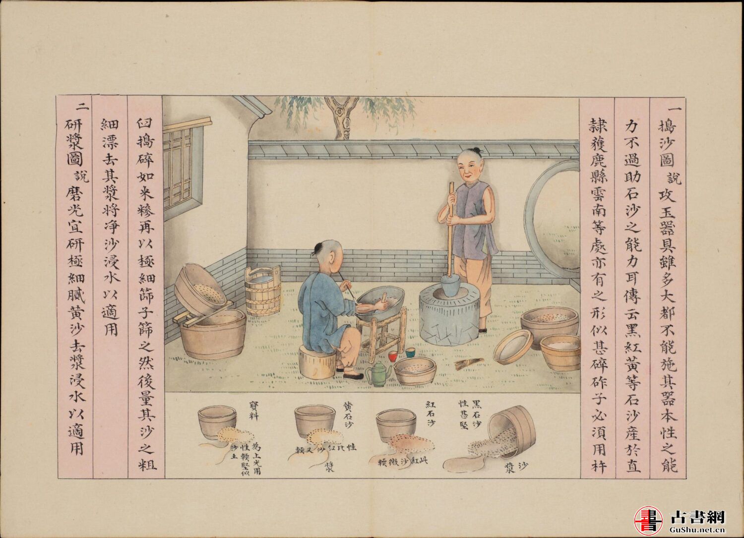 此画册不仅描绘了制玉人劳动操作的场面,还将重要工具名称都一一注明。共分为十三道工序,其 “捣砂图说” 和 “研浆图说” 合为一幅,三至十三的十一工序各为一幅,共十二幅。每幅中间是主画面,左右两侧有竖栏各三行,首行书工序编号和工序名。后楷书说明文。