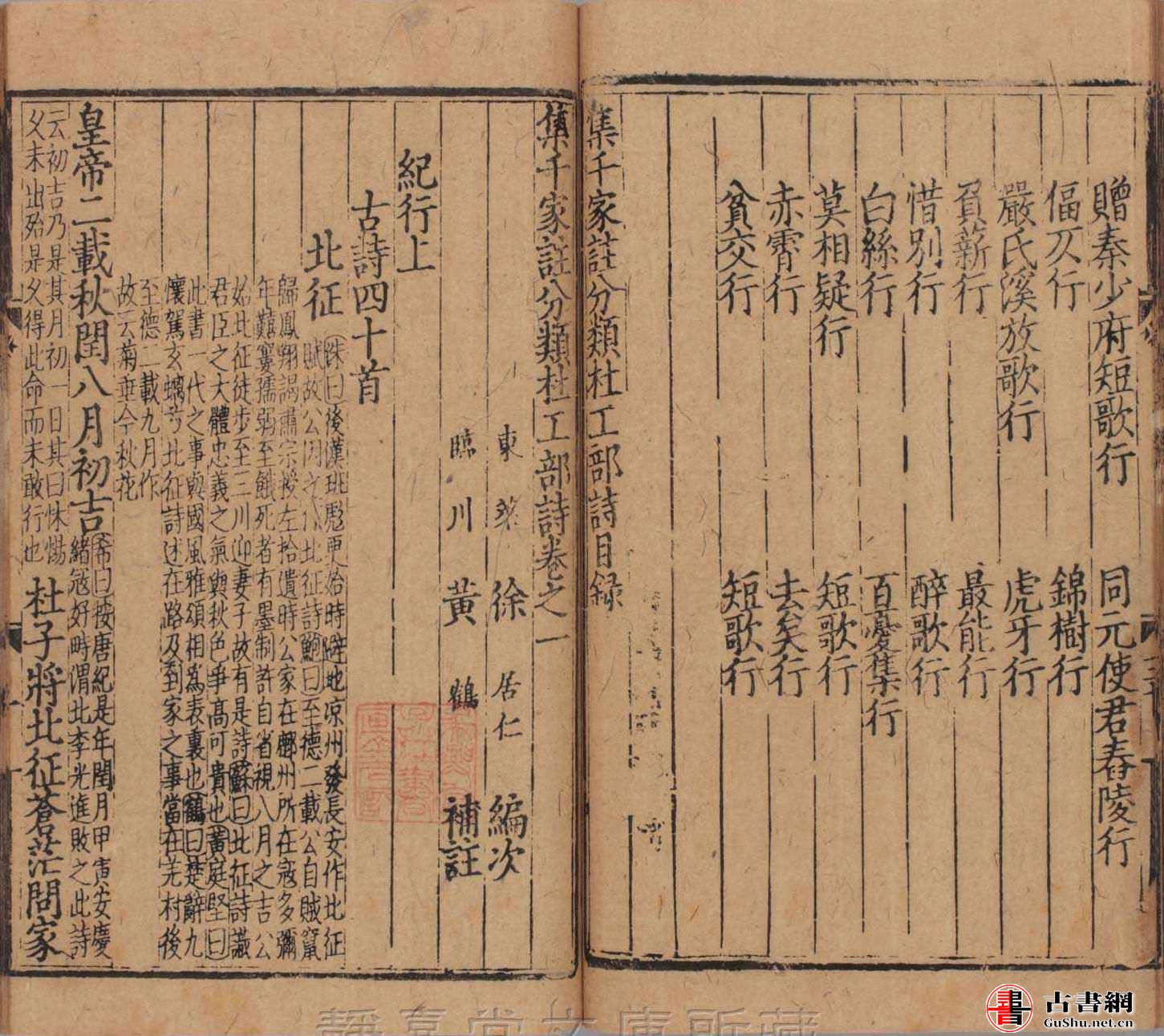 元版. 集部. 集千家注分类杜工部诗.25 卷. 首目 2 卷. 唐. 杜甫撰. 宋. 徐居仁编. 黄鹤补注. 元至正 8 年圭山书院覆元皇庆元年建安勤有堂刊本.20 册