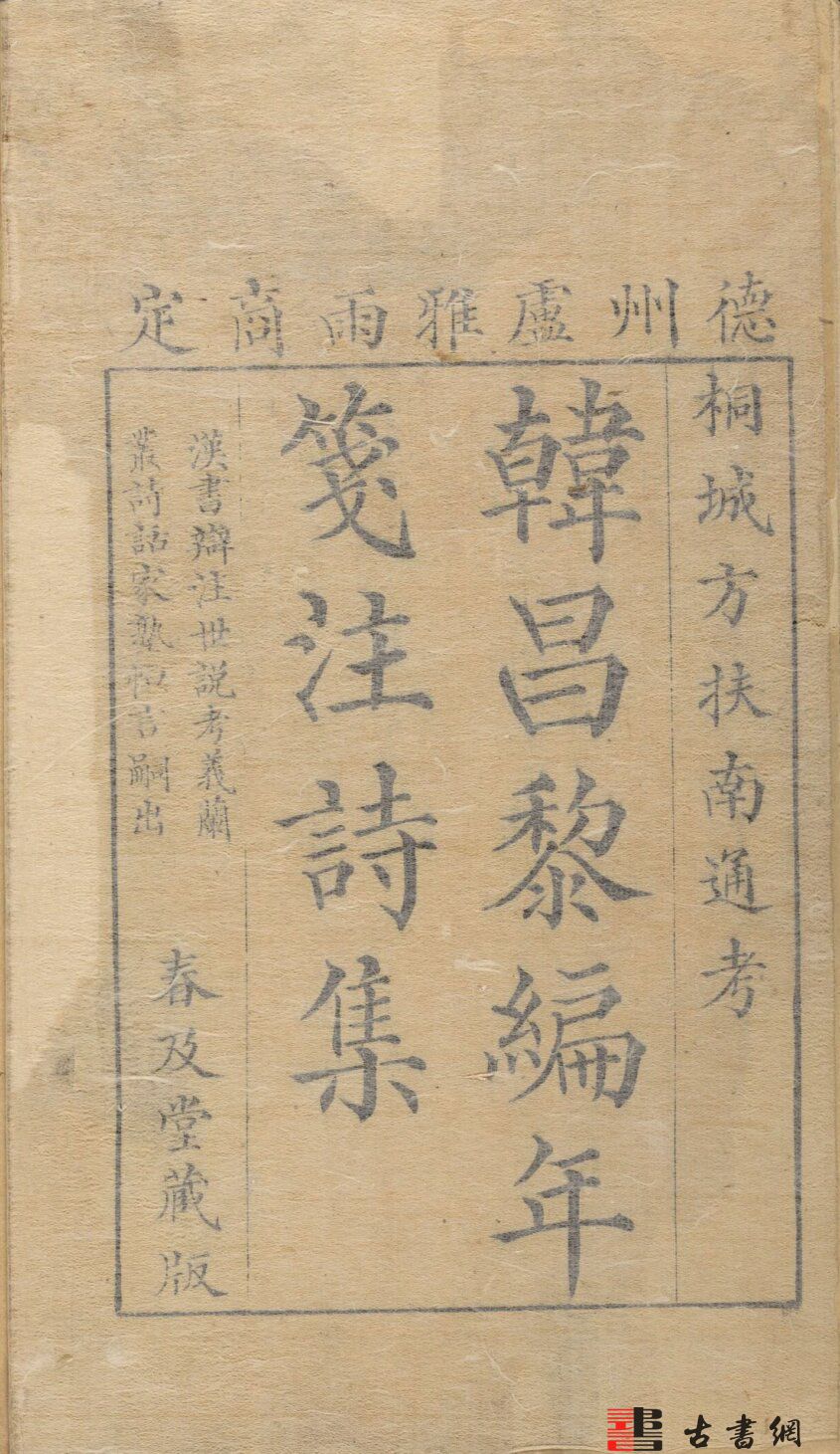 此《韩昌黎诗集编年笺注》由清代方世举编集。全书共十二卷,所收韩愈(世称韩昌黎)诗四百余首。是书以编年体为例,每卷先述其年谱再录诗文。作者集多家之言,并根据自身理解对诗文注疏(如:典故、人物、名物、制度等)。此为清乾隆二十三年德州卢氏雅雨堂写刻刊本。