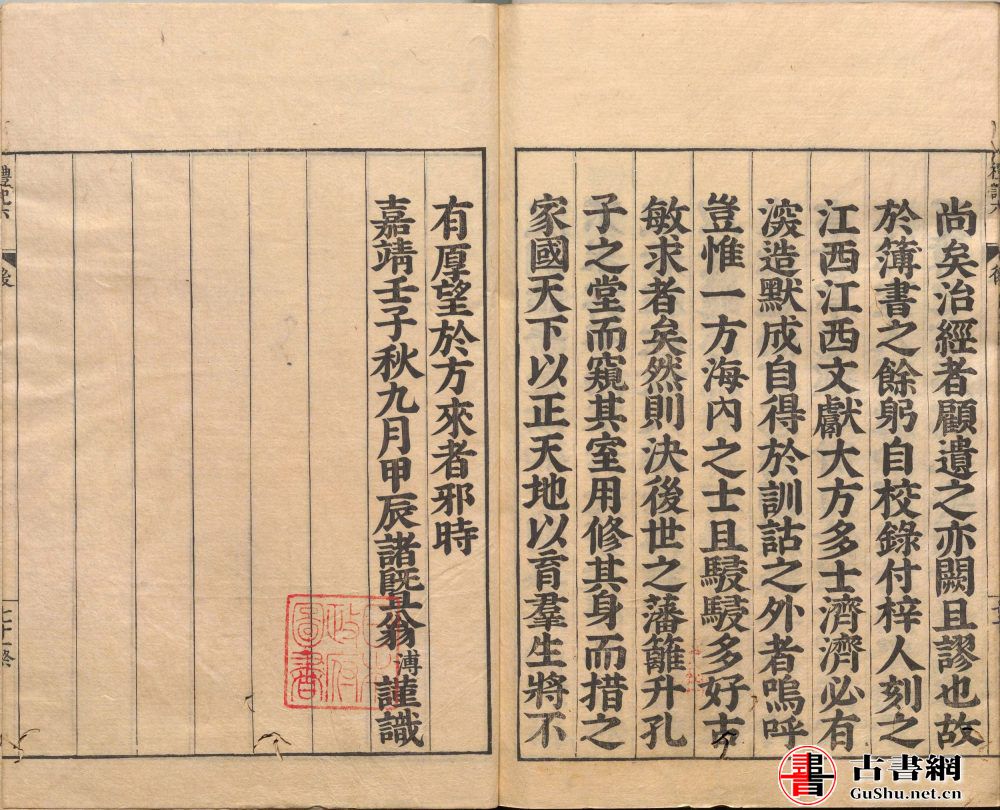 周易:两卷、图一卷 《周易》也称《易》《易经》,本是古代占卜之书,包括《经》和《传》两部分。《经》文叙述了六十四卦三百八十四爻。《传》为解释卦名、卦义、卦辞、爻辞的七种十篇,称为 “十翼”“《易传》”“《易大传》”。八卦和六十四卦的出现当在西周以前的远古年代,有学者认为《经》的编订在商末周初,《传》作于春秋战国,非一人一时之作。古人认为经伏羲、周文王、周公、孔子等历代圣人编定而成。内容广泛记录了西周社会各方面,包含史料价值、思想价值和文学价值。其外层神秘,而内蕴的哲理至深至弘。 尚书:两卷 《书经》/《尚书》古时称《书》,是记言记事的简册泛称,主要记载帝王言论及活动。到孔子时代,《书》大约只残存百余篇,诸子百家多有引用,孔子作了整理。秦朝时民间所藏的《书》基本上被焚毁,国家所藏的《书》也毁于战火。汉文帝时,秦朝博士伏生讲授保存下来的 28 篇《尚书》,用当时通行的隶书写成,称为《今文尚书》。《尚书》的称谓中 “尚” 便指 “上古”,记载上起尧舜,下至东周,是现存最早的一部历史文献汇编,基本内容是古代帝王的文告和君臣谈话内容的记录。 诗经:三卷 《诗经》在先秦称《诗》或《诗三百》,是中国第一本诗歌总集。汇集了春秋中期前的诗歌三百零五篇。《诗经》认为是由孔子所编定。但学者认为是由鲁国乐官所编。《诗》分 “风”、“雅”、“颂” 三部分,“风” 为土风歌谣,“雅” 为西周王畿的正声雅乐,“颂” 为上层社会宗庙祭祀的舞曲歌辞。此书广泛地反映了当时社会生活各方面,被誉为古代社会的人生百科全书,对后世影响深远。汉时有鲁、齐、韩三家言《诗》,后来又有《毛诗》。只有《毛诗》流传至今。 春秋:两卷 《春秋》本是记事史书的通称,但流传下来的只有鲁国的《春秋》。其编者一般认为是孔子,鲁哀公十四年(公元前 481 年)西狩获麟,于是孔子有感于自己的主张不行于天下,于是取鲁国《春秋》进行加工编撰。全书纪事从鲁隐公元年(公元前 722 年)到鲁哀公十四年(公元前 479 年),共 242 年。后人因此称东周前期为春秋时期。其书用鲁国纪元兼记各诸侯国事,是现存最早的编年史。记事的目的是提倡道义和 “礼”。而春秋本身的文字极为精简,所以后世流传有《公羊传》《穀梁传》《左传》三传来解释原文。 礼记:六卷 《礼记》亦称《小戴礼记》,共 49 篇,是先秦到秦汉时期的礼学文献选编。最初为西汉的戴圣所纂,但非出于一时一人之手。戴圣本是今文《仪礼》博士,《仪礼》仅 17 篇,所记大多为士礼,故汉朝的儒家学者杂采当时能见到的各种文献以为己用。其内容较为驳杂,大致有记述礼节、记述政令、解释《仪礼》、记孔子言论、记述孔门及时人事、礼节考证、通论礼意或学术、记述制度、记述掌故、杂记等十种。东汉时郑玄为之作注,其文字较为通畅易读,流传较广。唐朝时取代《仪礼》的地位。 礼记卷末有:(書刻五經正文後)嘉靖壬子秋九月甲辰諸暨翁溥謹識 翁溥,字德宏,号梦山,明代诗人、官员。暨阳蕙渚翁氏第廿七世,行儒三,属五房派裔孙。翁溥自幼勤奋好学,嘉靖八年进士,累官至南京刑部尚书。 叶(xié)韵,一作 “谐韵”、“协韵”。诗韵术语。谓有些韵字如读本音,便与同诗其他韵脚不和,须改读某音,以协调声韵,故称。南北朝有些学者按当时语音读《诗经》,感到好多诗句韵不和谐,便将作品中某些字临时改读某音。明陈第始用语音演变的原理,认为所谓叶韵的音是古代本音,读古音就能谐韵,不应随意改读。"叶韵"或称 “叶句”(叶,同 “协”,和谐之意)。
