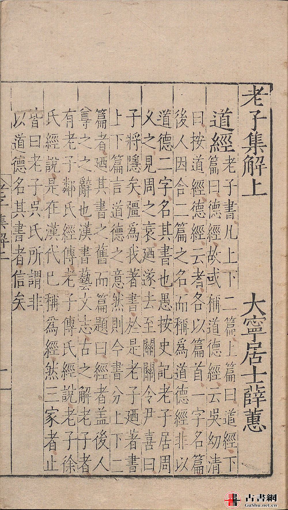 此《老子集解》由明代薛蕙集解。全书分作道经、德经二篇,八十一章,依王弼本章次顺文作解,首列关键字句音义,复引旧注并加己见以解全句。旧注凡二十余家,每引程朱加以批判,多引吴澄加以申述。后附考异一卷。此为明嘉靖时期刊本。