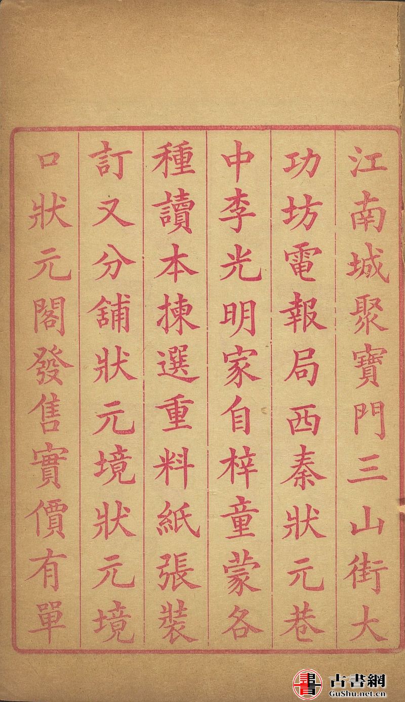 江南城聚寶門三山大街大功坊電報局西秦狀元巷中李光明家自梓童蒙各種讀本揀選重料紙張裝訂又分鋪狀元境口狀元閣發售實價有單。