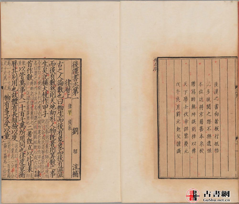 後漢之書向者板行抵牾 / 尤多披閱之際不無遺恨 / 本位近得京蜀善本參校 / 謄寫的无舛誤刻梓以傳 / 天下學士伏幸詳鑒慶元 / 戊午良月劉元起父謹識