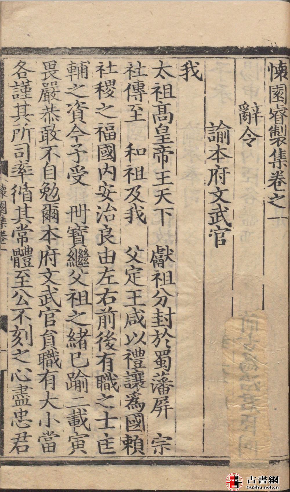明代被册封在成都的蜀藩王被称为蜀王。此内含明代蜀王文集四种:蜀献王朱椿的《献园睿制集》、蜀定王朱友垓《定园睿制集》、蜀怀王朱申鈘《怀园睿制集》、蜀惠王朱申凿《惠园睿制集》。此系列为明代成化至弘治年间蜀王府刊刻,国内已佚,现藏于日本内阁文库。