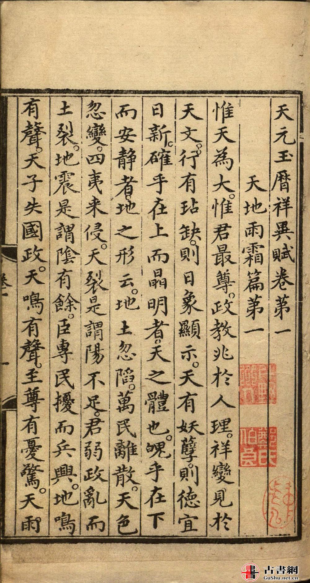 《天元玉历祥异赋》为明仁宗朱高炽洪熙元年御定。其内容集结了从晋到明历代各书中所载的:天、地、日、月、五星、彗星、流星、风雨虹霓等大气现象,以及与之对应的古代占星术内容。此内含明代蓝格旧钞彩绘本(十册)、明成化弘治时期翻刻内府本(七卷,五十五篇)。