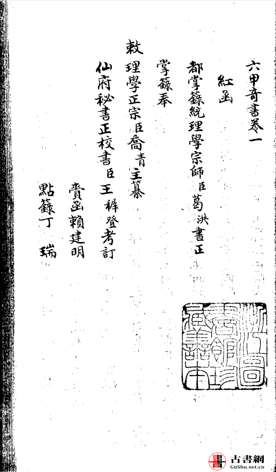 卷一 遁甲紅函(遁甲變化經表、遁甲真經序、遁甲真經、祭造印法、天印式、地印式、祭六丁壇式、玉女陽印式、玉女陰印式、真武印式、造壇法、入壇行事、變神呪、三台式、三台呪、斗式、大星交機禹步、步罡呪、總召符、總召真言、總呪、總祭符、六丁像儀服色、大會祭儀、請六陰玉女申狀式、大會甲子夜申狀式、玉女像背符、奉請玉女法、壇內祭品、又陽印式、又陰印式、又真武印式、又六陰像背符、又六陰本身符、又六陰合同符、又六陰本身呪)