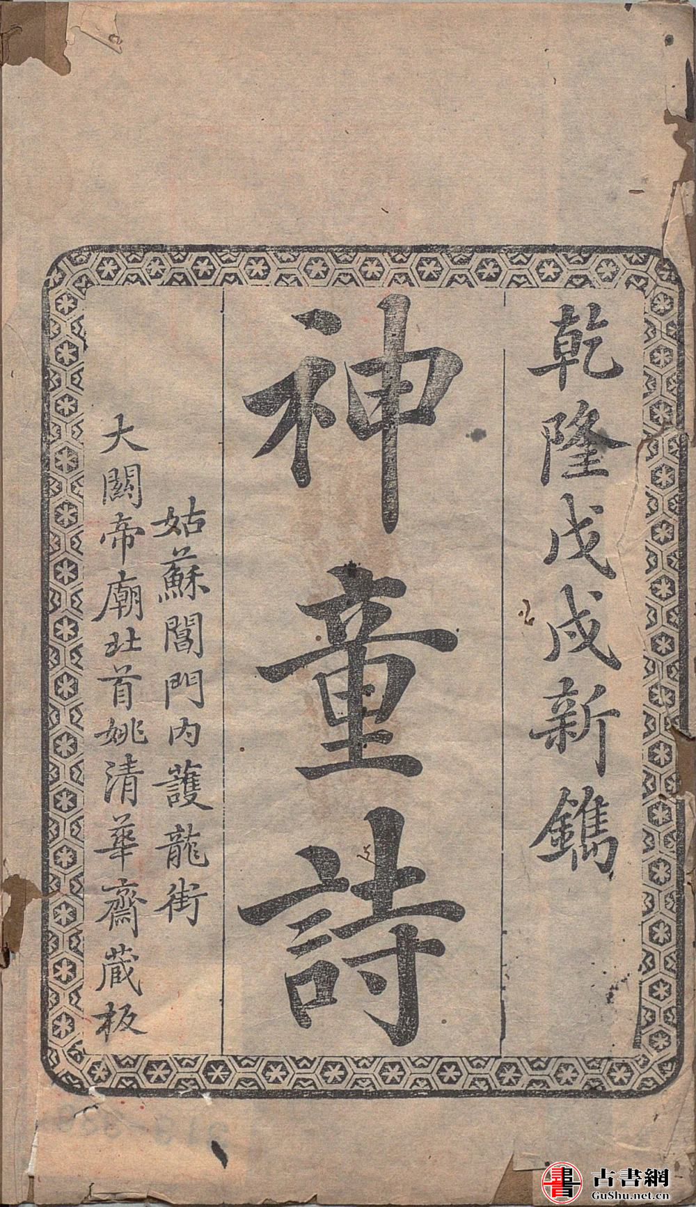 书名页题:乾隆戊戌新鐫/神童詩/姑蘇閶門内護龍街/大関帝廟北首姚清華齋藏板