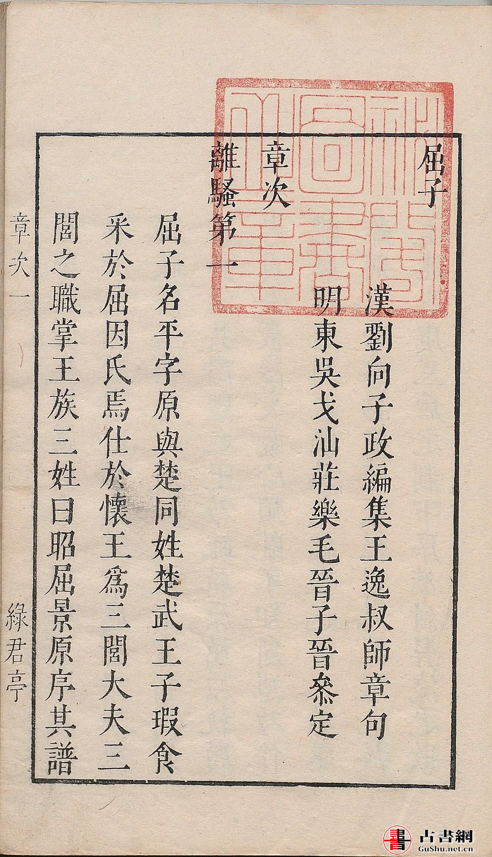 叙 总评、章评 屈子:章次、离骚、九歌、天问、九章、远游、卜居、渔父 楚译:译韵上、译字下 传、凡例 卷首署:漢劉向子政編集王逸叔師章句、明東吳戈汕莊樂毛晉子晉參定