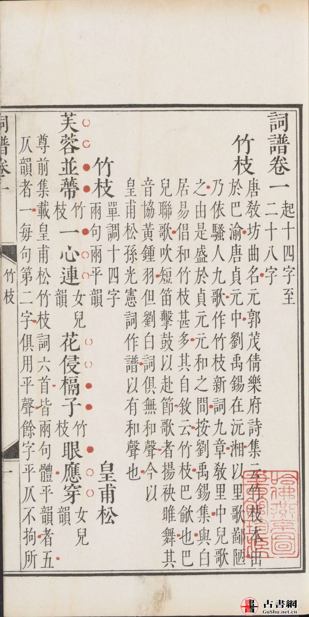 每调一词,旁列一图,以虚实朱圈分别平仄,平用虚圈,仄用实圈,字本平而可仄者上虚下实,字本仄而可平者上实下虚。至词中句法,如诗中五言、七言者,其第一字、第三字类多可平可仄,似不必拘谱,内亦参校旧词,始为作图。至一定平仄,别谱有异同者,必引证其句,注明本词之下又可平可仄,中遇去声字,最为紧要,平声可以入声替上声,不可以去声替。沈伯时《乐府指迷》论之最详,谱中凡用去声字不可易者,悉为标出。