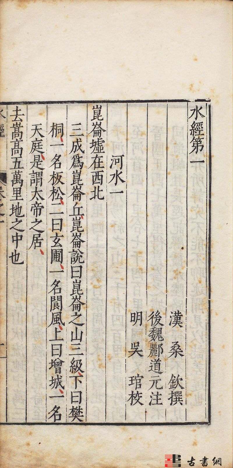 此《水经》题作汉桑钦撰,因北魏时期郦道元注而得名《水经注》。全书共四十卷,始于河水、汾水,终于渐江水、斤江水。其内容以《水经》为纲,详细记载了一千多条大小河流及有关的历史遗迹、人物掌故、神话传说等,是中国古代最全面、最系统的综合性地理著作。此为明万历时期吴琯校刊本。