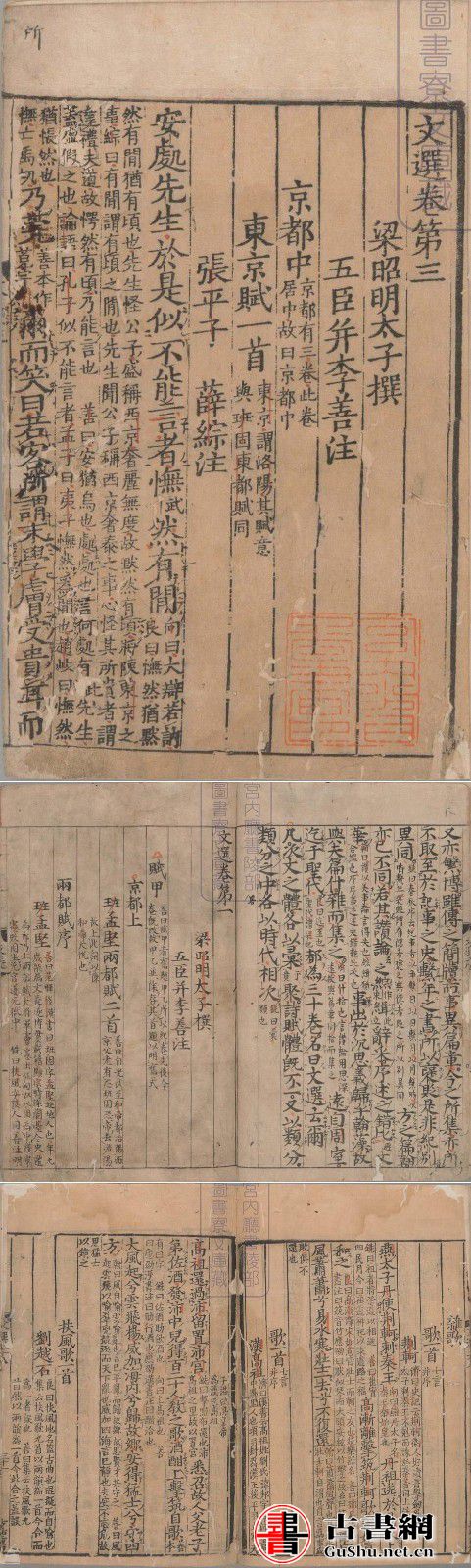 文选.60 卷. 目 1 卷. 重存卷 1 至 2. 梁. 萧统. 编. 唐五臣. 吕延济. 刘良. 张铣. 吕向. 李周翰. 并李善注. 南宋初明州刊本. 南宋递修。日本宫内厅书陵部藏