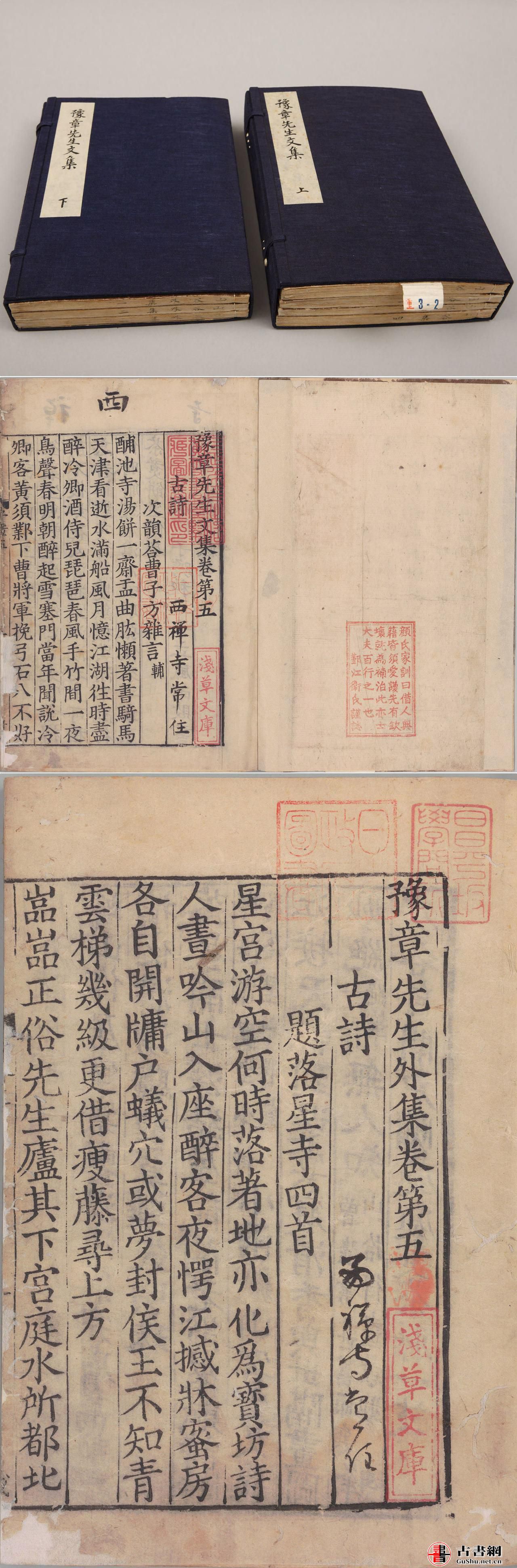书前附有近代著名藏书家和版本目录学家傅增湘于庚辰夏(1880年)六月六日书写的题跋。跋中对此本的内容和版刻流传经历、版本优劣情况做了详细说明。跋后钤有篆书白文小方印"傅增湘"。此本半页13行23字,黑口,单鱼尾,四周双栏。卷首序文已不存。首为豫章罗先生年谱,卷端题名后钤有篆书朱文印,印文依次为"佩德斋珍藏印"、"密庵藏书",下题"进士曹道振编次校正 后学谢鸾重校新刻"。次为目录,共分十七卷,后钤傅增湘先生的一方篆书朱文印"忠谟读书"。一卷卷端题名后钤篆书朱文印,印文依次为"双鉴楼藏书印"、 "密庵藏书"。从这些藏书印鉴可知,此本为傅增湘"双鉴楼"的藏书。从傅增湘先生题跋中对此本版刻源流的详尽记载可知,此本为明嘉靖三十三年谢鸾重校刻本。其狭行细字,字体圆湛,褚墨精丽,雕镂精致,极似元本。