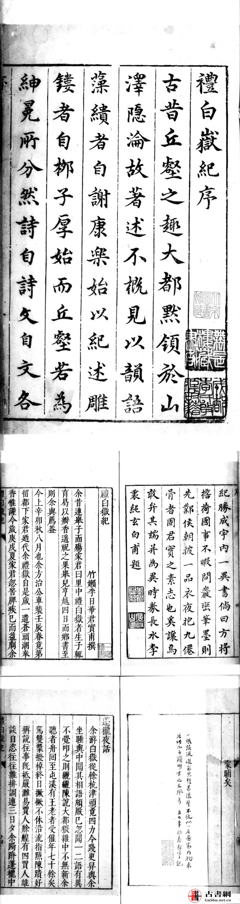 是书自纪其万历庚戌礼神白岳之事。卷末又题曰《蓬栊夜话》。殆是书有二名耶。《因树屋书影》曰:“尝见槜李李君实所为《礼白岳记》。分视之各为一则,合视之共为一记,而诗即连缀于中。分视之则诗,合视之诗亦记也。诗文照映,使山水神情无所遁于其间,真是合作。今人为游记者,意在谋篇,终难逐境。章法固自贯串,境地终未分明。且记自记,诗自诗,使读者因记以忆诗,持诗以录记,笔墨间隔,神情不属,不数行欠伸欲卧矣。故予以为李公之记,可为今人法也” 云云。其推挹甚至,然终不出万历后纤巧之格。所谓才士之文,非作者之文也。