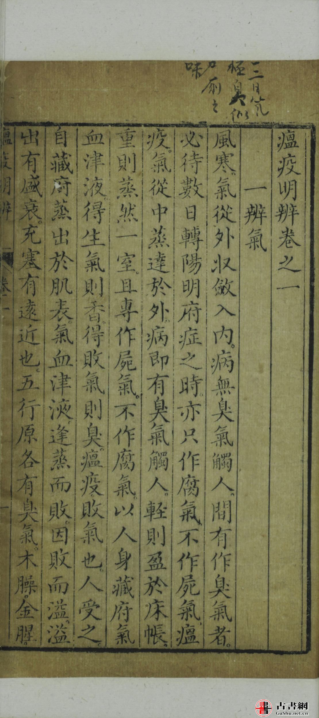 原序、吴文坫序、杨瑗序、汪祺序、目次 卷一:一辨气、二辨色、三辨舌、四辨神、五辨脉、辨时行疫疠与风寒异气、辨时行疫疠与风寒异受、辨传经、兼寒、兼风、兼暑、兼疟、兼痢、夹痰水、夹食、夹郁、夹血、夹脾虚、夹肾虚、夹亡血、夹疝、夹心胃痛、夹哮喘 卷二:表证、发热、恶寒、寒热往来、头痛、头眩、头胀、头重、目胀、项强酸、背痛酸、腰痛酸、膝痛酸、胫腿痛酸、足痛、肩背痛酸、腕痛、周身骨节酸痛、身重、自汗、盗汗、战汗、狂汗、头肿、面肿、颈项肿、耳旁肿、胸红肿、周身红肿、发黄、发疹、发斑 卷之三:里证、烦躁、呕、咳、渴、口苦、口甘、唇燥、齿燥、鼻孔干、耳聋、鼻如烟煤、鼻孔扇张、咽干、咽痛、舌燥、舌强、舌卷短、胸满痛、胁满痛、少腹满痛、自利、便血、便脓血、大便闭、小便不利、小便黄赤黑、小便多、遗尿、囊缩、多言、谵语、狂、善忘、昏沉、循衣、摸床、撮空、多睡、身冷、呃逆、吐蛔 卷之四:汗法、下法、清法、和法、补法、四损、四不足、三复、辨似、发肿、发颐、发疮、发痿、索泽、发蒸、妇人、妊娠、小儿 瘟疫明辨后序(管希宁撰)、跋(臧锡麟撰)