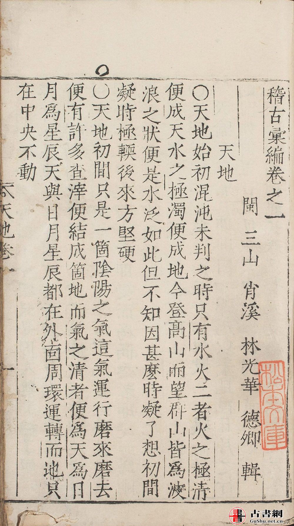 稽古汇编序(陈鸣金撰)、稽古汇编序(林光华撰)、目录 卷一:天地、天文、地理、考证 前题:閩 三山 肖溪 林光華 德卿 輯