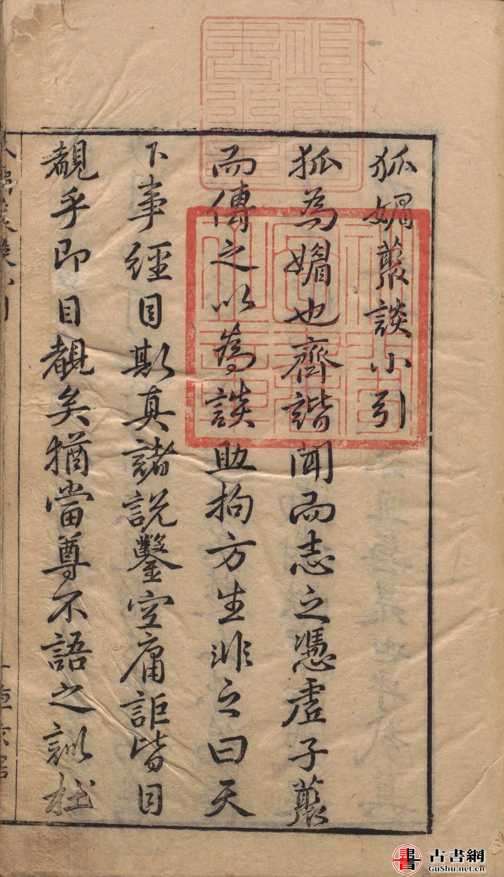 狐媚藂談小引(墨杘子撰)、目录 说狐 卷一:32 篇 书前墨杘子小引记:狐為媚也,齊諧聞而志之。憑虛子藂而傳之,以為談助……