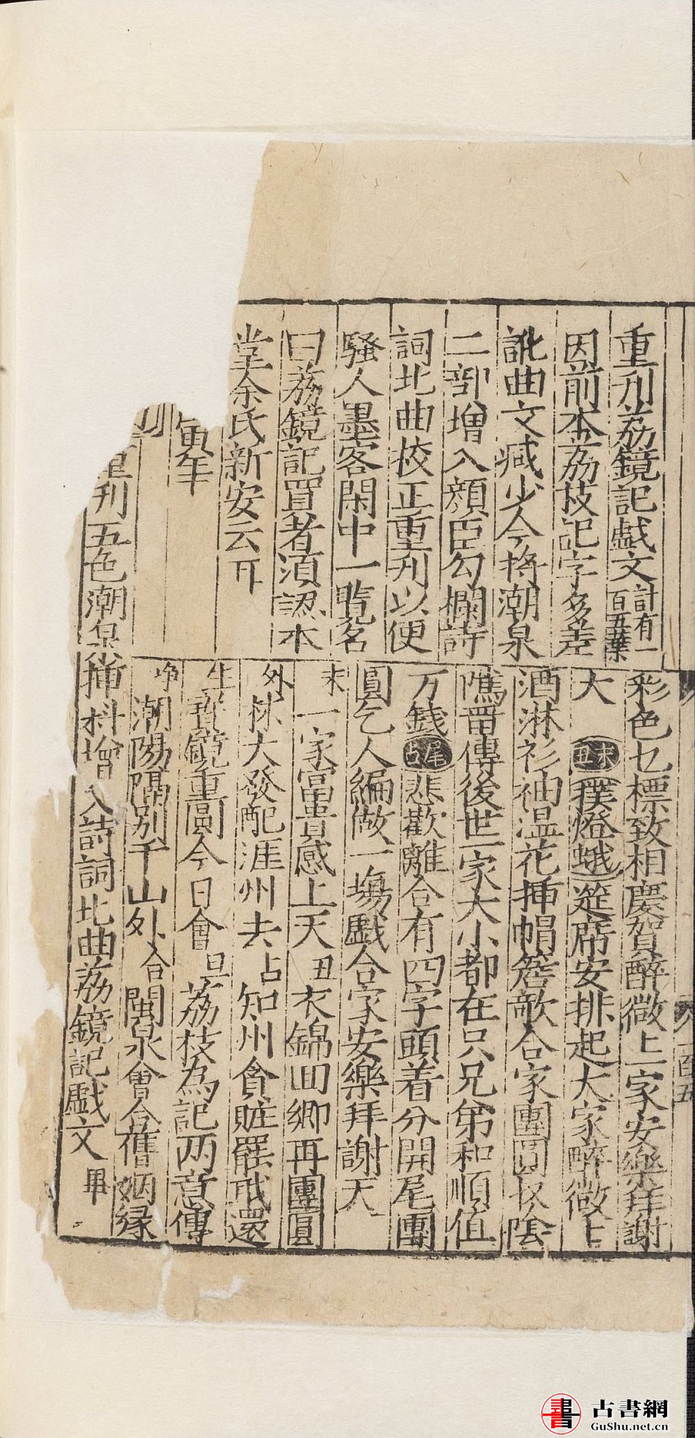 此《重刊五色潮泉插科增入诗词北曲勾栏荔镜记戏文》(荔镜记)又称《陈三五娘》为明朝传奇剧本,作者名已佚。全剧共五十五出,叙述泉州人陈三与潮州人黄五娘曲折的爱情故事,“荔” 与 “镜” 是两人之间的爱情物证。此为明嘉靖四十五年新安余氏刊本,分作三截:上为《颜臣》等、中为插图、下为戏文。