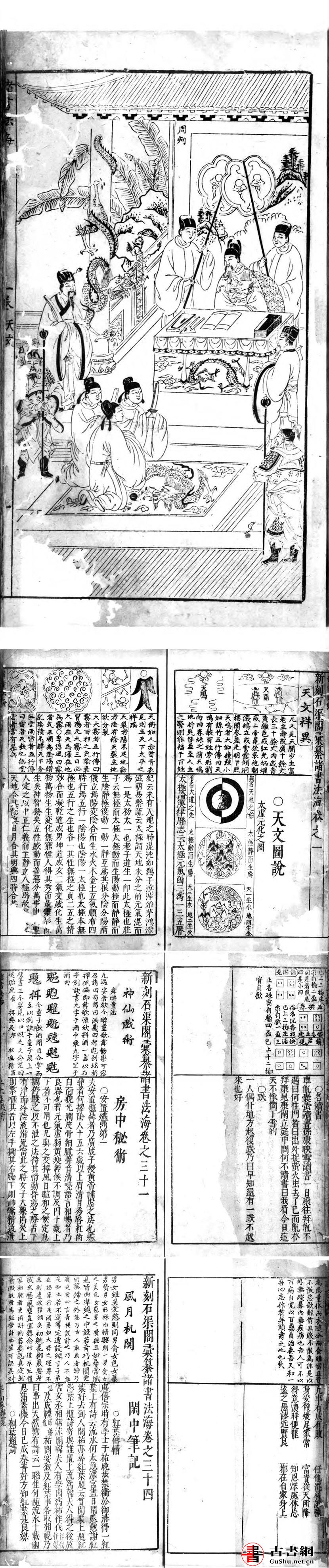 《新刻石渠阁汇纂诸书法海》三十四卷,16 册,(明)陈继儒编篡,刻于明末(1621-1644),页面上下栏。行字不一,属子类书。内容庞杂有天文. 地舆. 人纪. 诸夷. 官品. 冠婚. 丧祭. 诗对. 书启. 武学. 营宅. 莹葬. 养生. 致富. 律法. 状式. 医学. 卜巫. 星命. 相法. 克择. 梦课. 玄教. 八谱. 琴学. 棋学. 书谱. 春方. 算法. 训童. 杂览等等共计 34 大目(每一大目一卷),除了第 14 卷. 第 30 卷. 第 31 卷外每卷分 4 小目,这 3 卷每卷 3 小目,共计 131 小目。内容种类众多类似万宝全类书,此书内容收入严谨,资料编篡祥实,可择己好类研读。