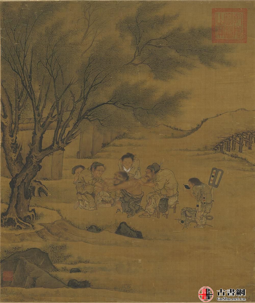 本幅旧传为李唐所作,画行脚医生执业情景。医生头插器械,以燃烧艾锥,替患者治疗红肿的背部,病人则挣扎惨叫,需三人合力,踩腿、拉手、按住肩膀,让其保持稳定。相对于目睹惨状,不忍卒睹的三人,右侧另有一名背插膏药招牌,身著膏药标帜服装的助手,正以口呵气,预备为病人敷上膏药。通幅用笔设色细腻写实,是南宋风俗画的院体杰作。画家以诙谐的方式,将人物表情描绘得既夸张又生动,为乡间生活注记下趣味的片段。此幅现藏于台北故宫博物院,绢本设色。