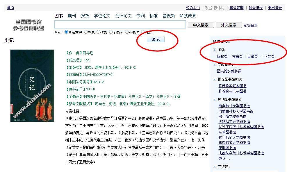 点击一部书,如果里面有试读,那就可以看到书中的内容,包括目录、出版介绍等。(关键时候很有用)